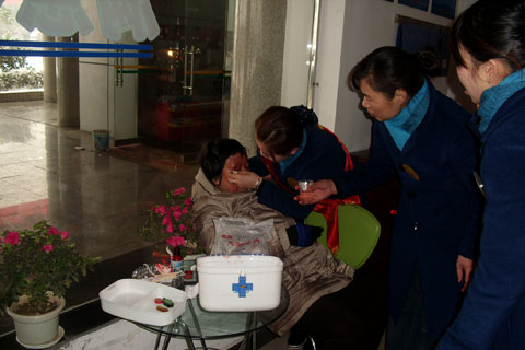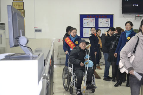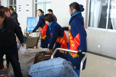 | 小辣椒服务员对老年旅客给予了主动、特殊的照顾。图为服务员帮老年旅客运送行李。 | 小辣椒服务员利用自备的轮椅护送残疾老人上车。 | 小辣椒服务员正在紧张、繁忙地为返乡旅客运送行李。 | 因道路冰冻,一名旅客在来站途中摔伤,小辣椒服务员对她进行了简单的救治,并及时联系120将其送到医院。 |