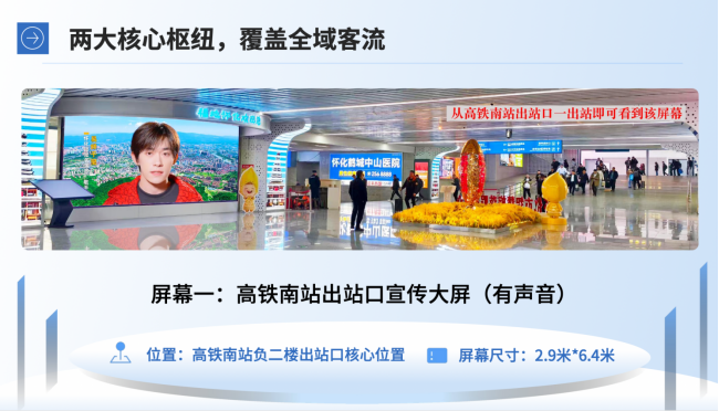 两块广告大屏则占据客流关键触点,是品牌宣传黄金阵地。负二楼高铁出站口咨询服务台大屏,直面每一位抵达怀化的旅客,曝光率拉满,助力品牌抢占游客第一印象;地面一层的 3D 裸眼大屏,凭借震撼视觉效果,吸引进站旅客与周边人群目光,可强效提升品牌知名度与市场渗透率,适合文旅景区、本地特产、消费品牌等各类主体投放。