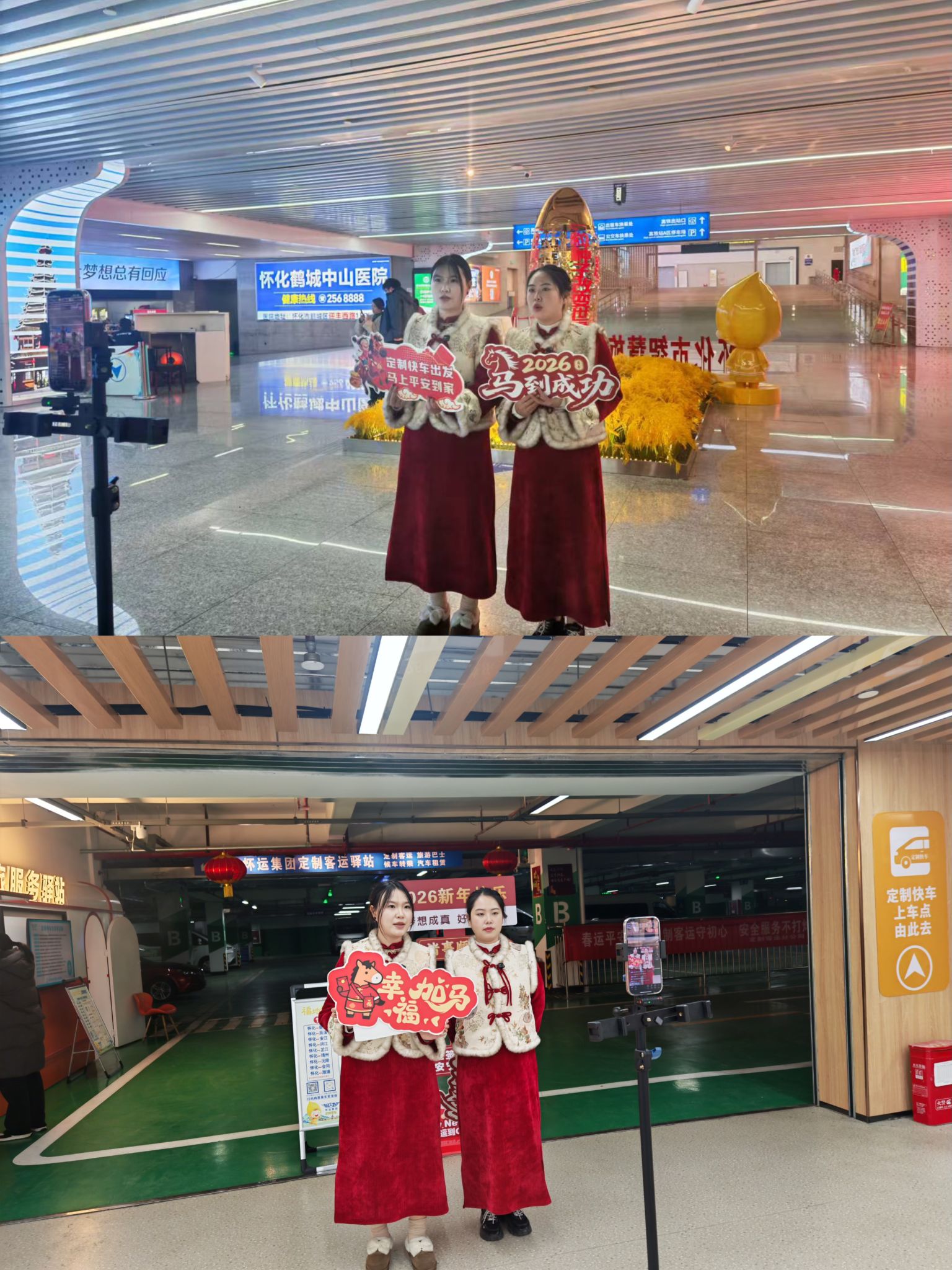 直播现场,两位身着喜庆红装的主播手持“定制快车出发 马上平安到家”“2026马到成功”主题手举牌,以充满年味的视觉呈现吸引了大量线上线下旅客的关注。她们围绕旅客最关心的问题展开讲解,包括春运热门线路、团体定制服务、购票流程、车辆安全保障及便民举措等内容。