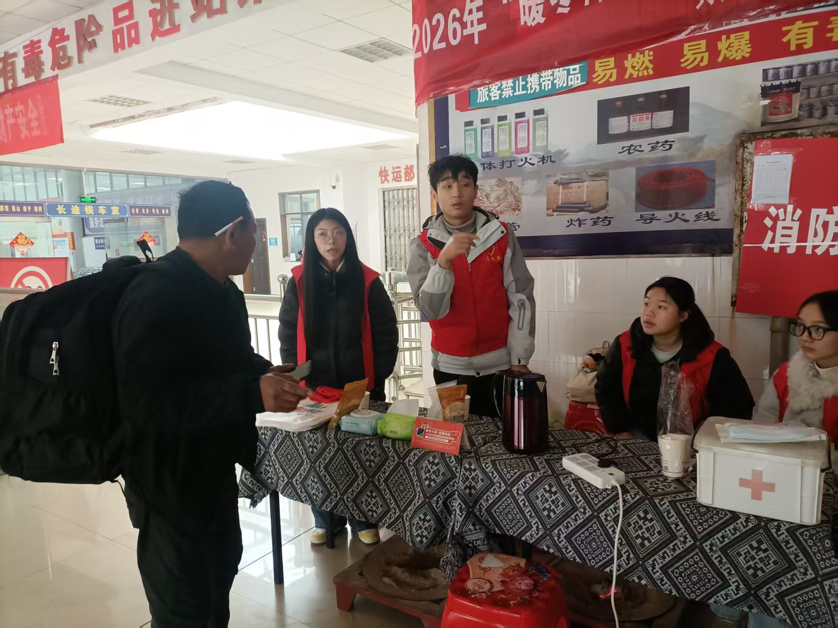 2026年春运大幕已正式拉开,为切实保障春运期间汽车站旅客出行顺畅、便捷、暖心,通道县新时代文明实践中心牵头组织的“情暖春运”志愿服务队于2月2日正式进驻县汽车站,开展为期40天的春运志愿服务活动。本次活动共招募来自县直机关单位、本地高校、社会爱心团体,经过岗前专业培训后,全部分配至购票引导、候车服务、秩序维护、重点帮扶等多个岗位,以饱满的热情开启春运暖心服务之旅。