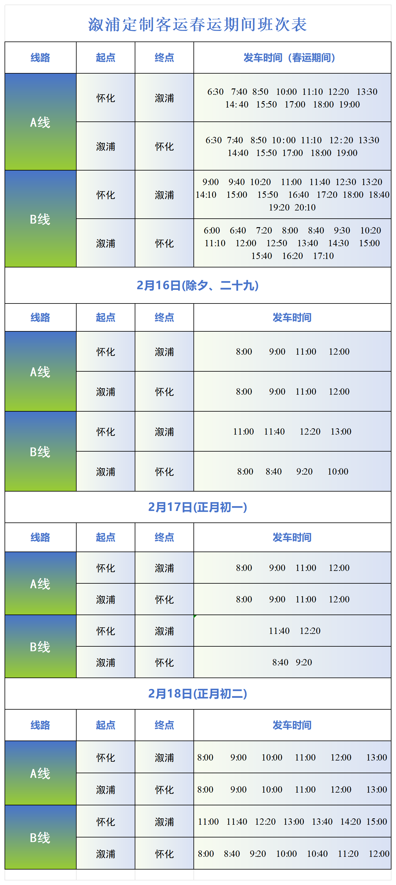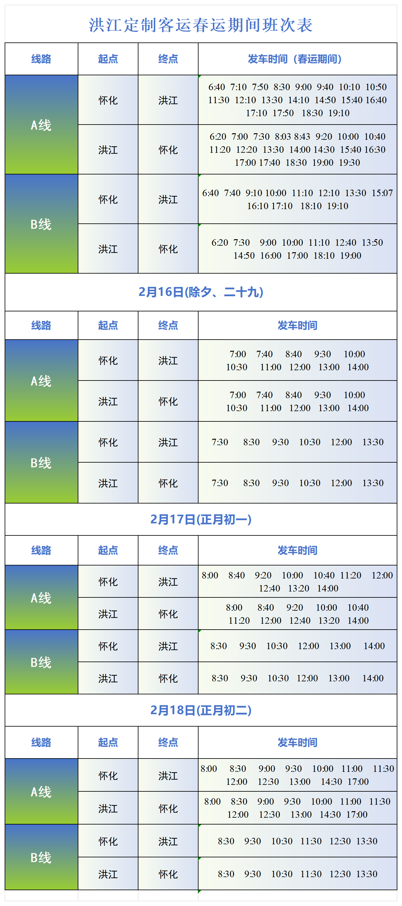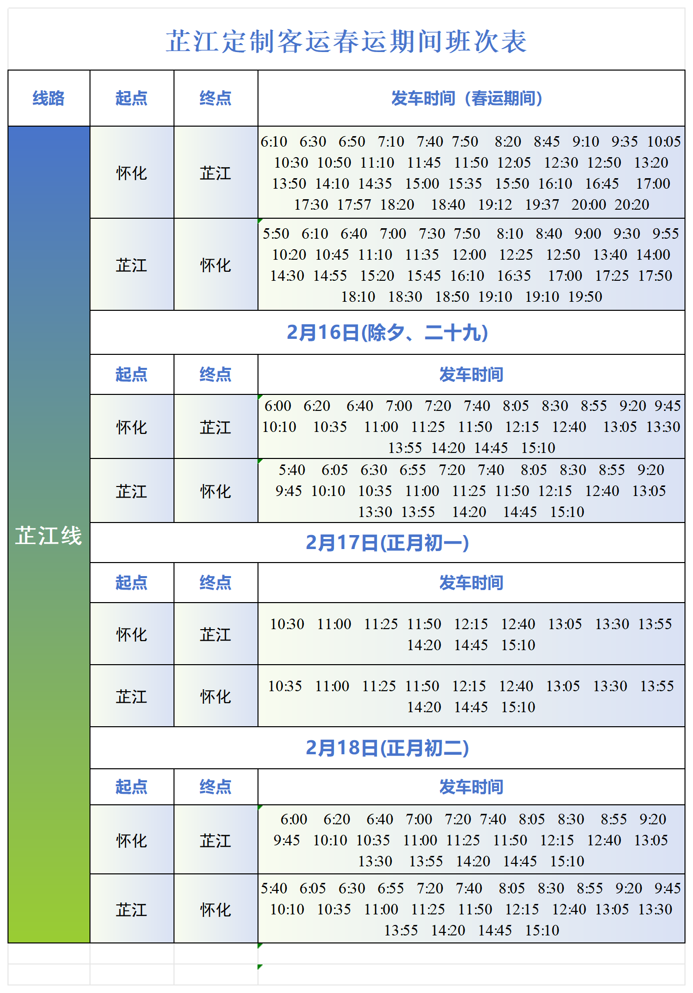 2026年春运已于2月2日启动,将持续至3月13日共40 天,怀化公路运输集团现将所属分公司开通“福地怀化行”定制客运线路的车次信息予以公布,助力大家平安顺畅返家、舒心便捷出行。