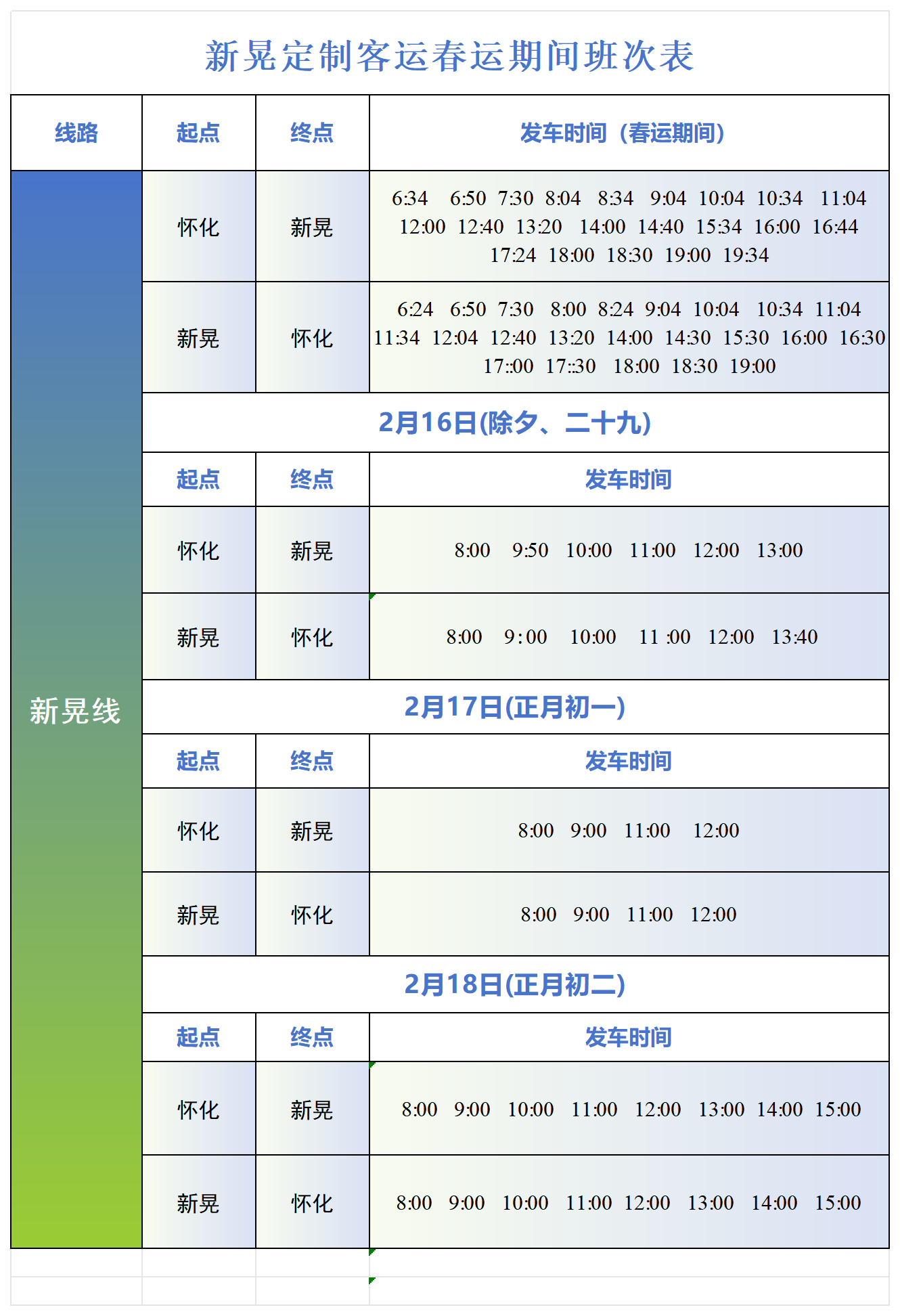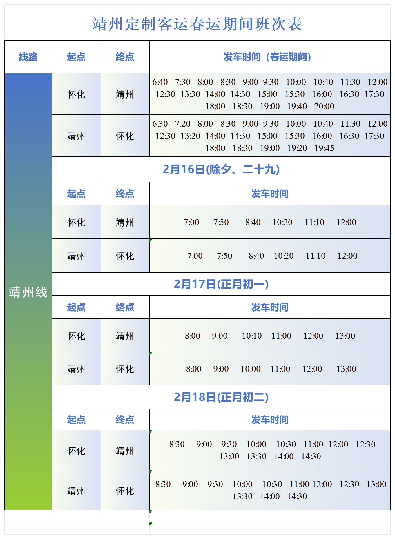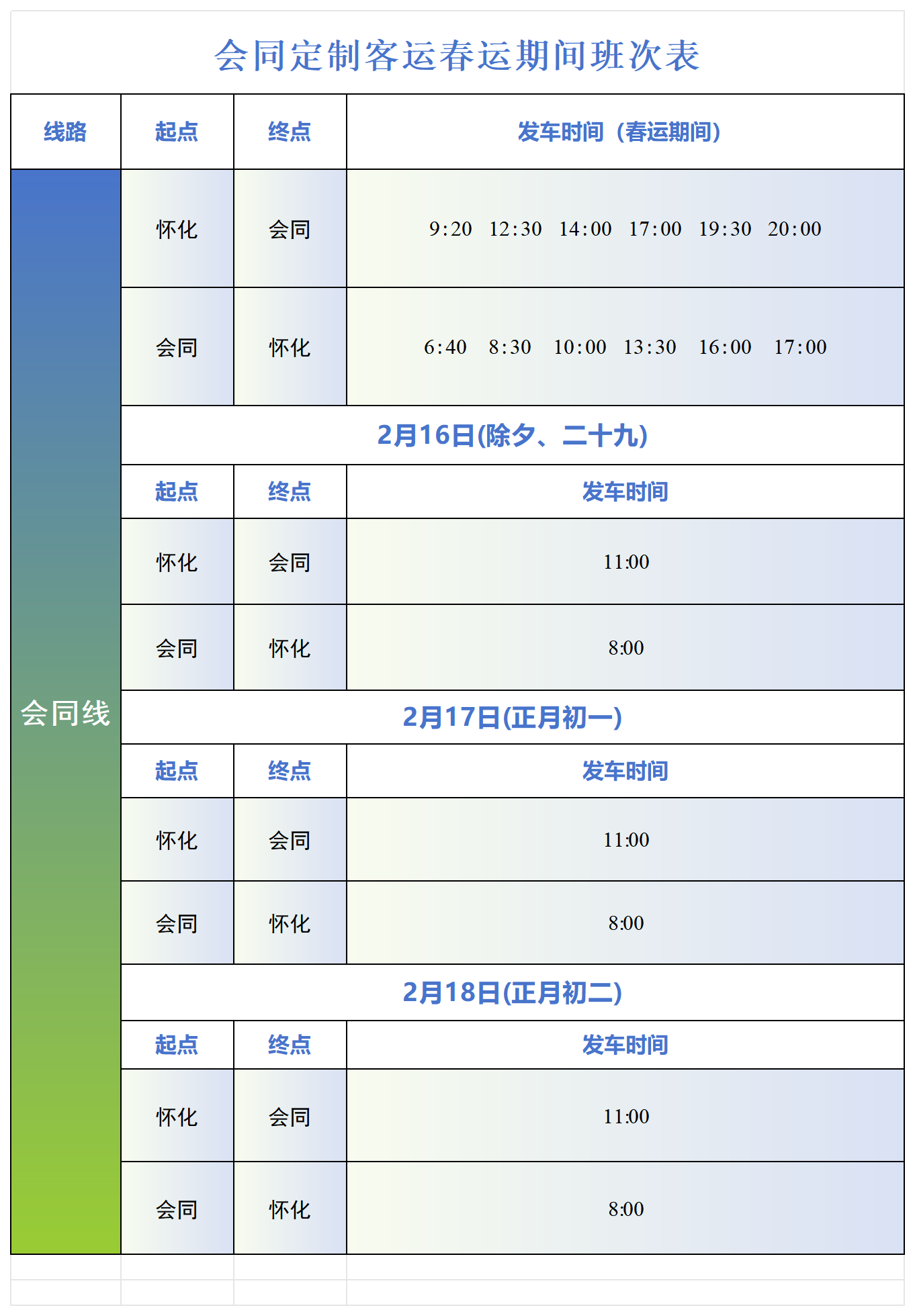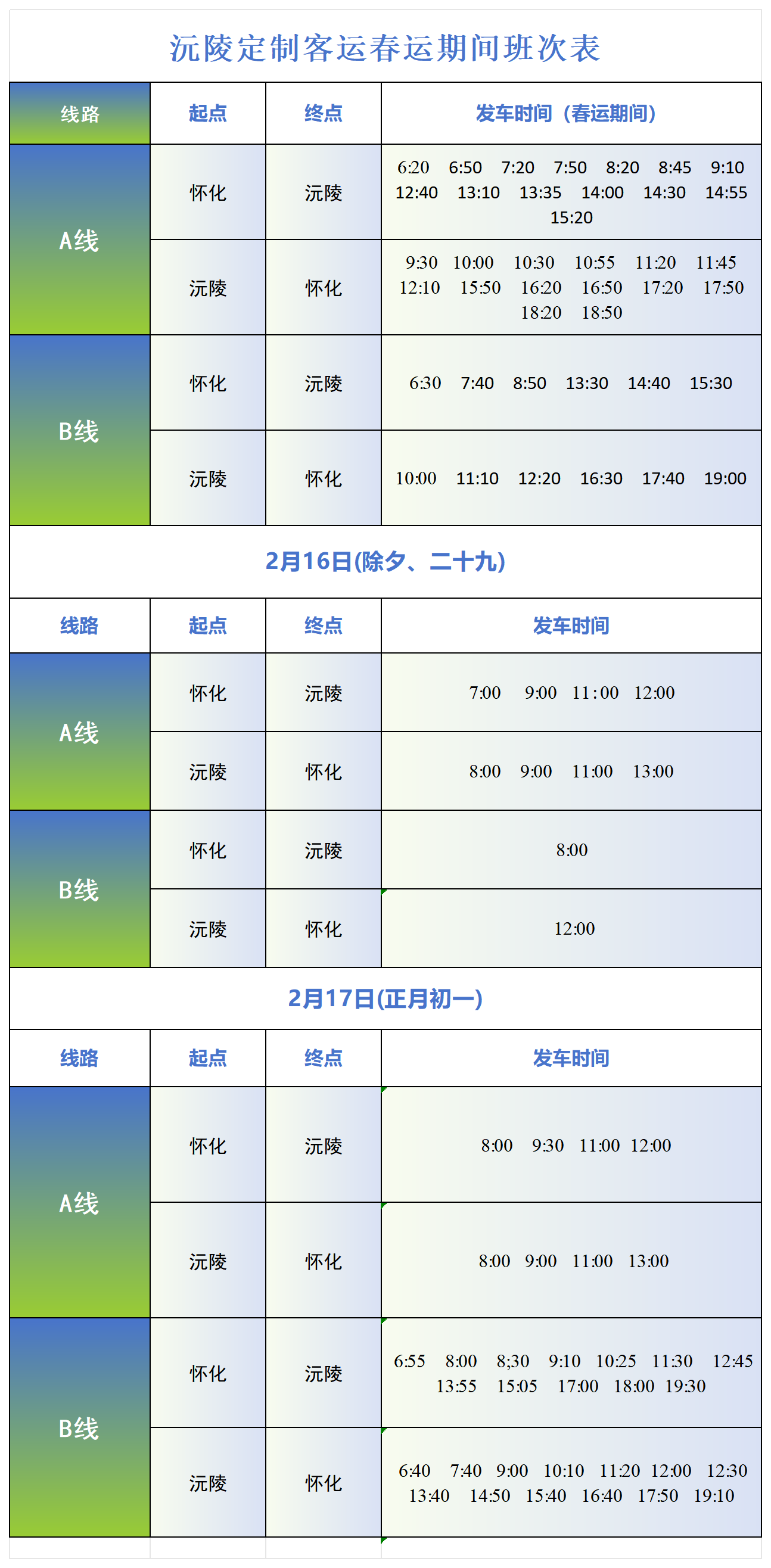 2026年春运已于2月2日启动,将持续至3月13日共40 天,怀化公路运输集团现将所属分公司开通“福地怀化行”定制客运线路的车次信息予以公布,助力大家平安顺畅返家、舒心便捷出行。