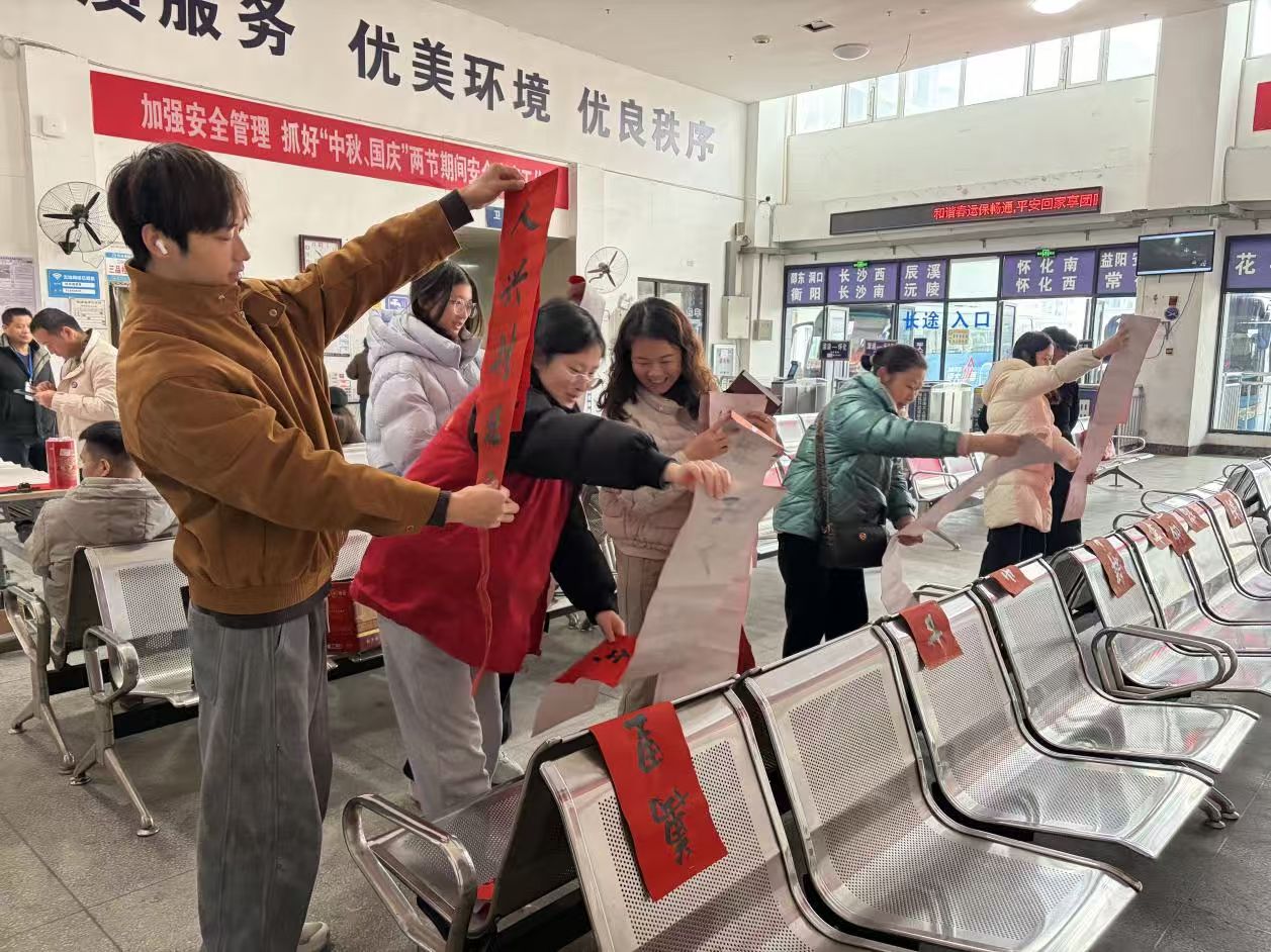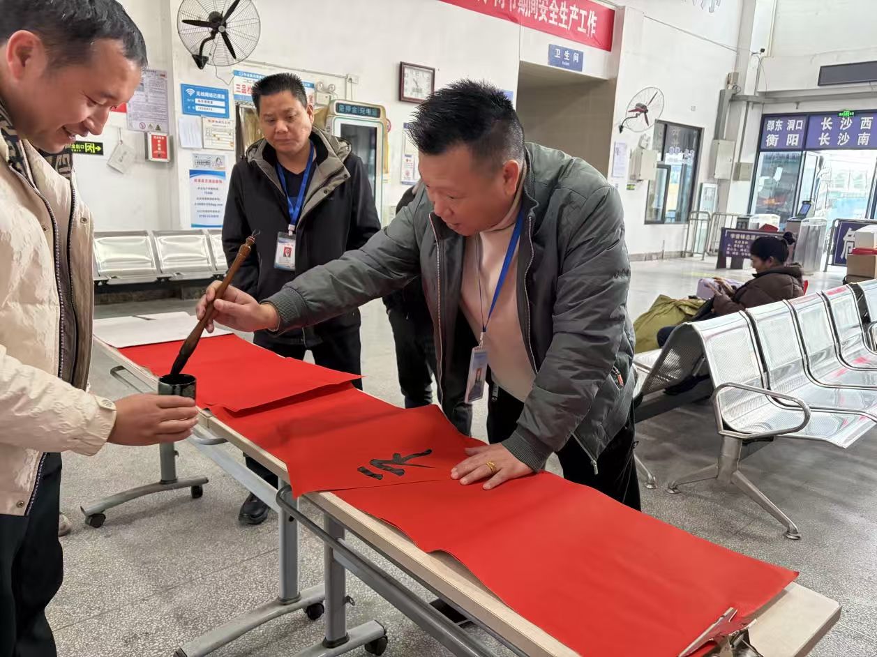 在蒋利军同志的带动下,分公司工作人员纷纷提笔参与书写,将廉洁箴言与新春祝福凝于字里行间,一张张书写工整的春联、一个个圆润饱满的“福”字,成为传递清廉文化、寄托美好期盼的特殊载体。书写完成后,工作人员手持春联,主动走向候车室的过往乘客,逐一送上这份特殊的“新春廉礼”,乘客们接过墨迹未干的春联,脸上洋溢着幸福的笑容,纷纷对此次活动表示称赞,现场互动氛围温馨而热烈。