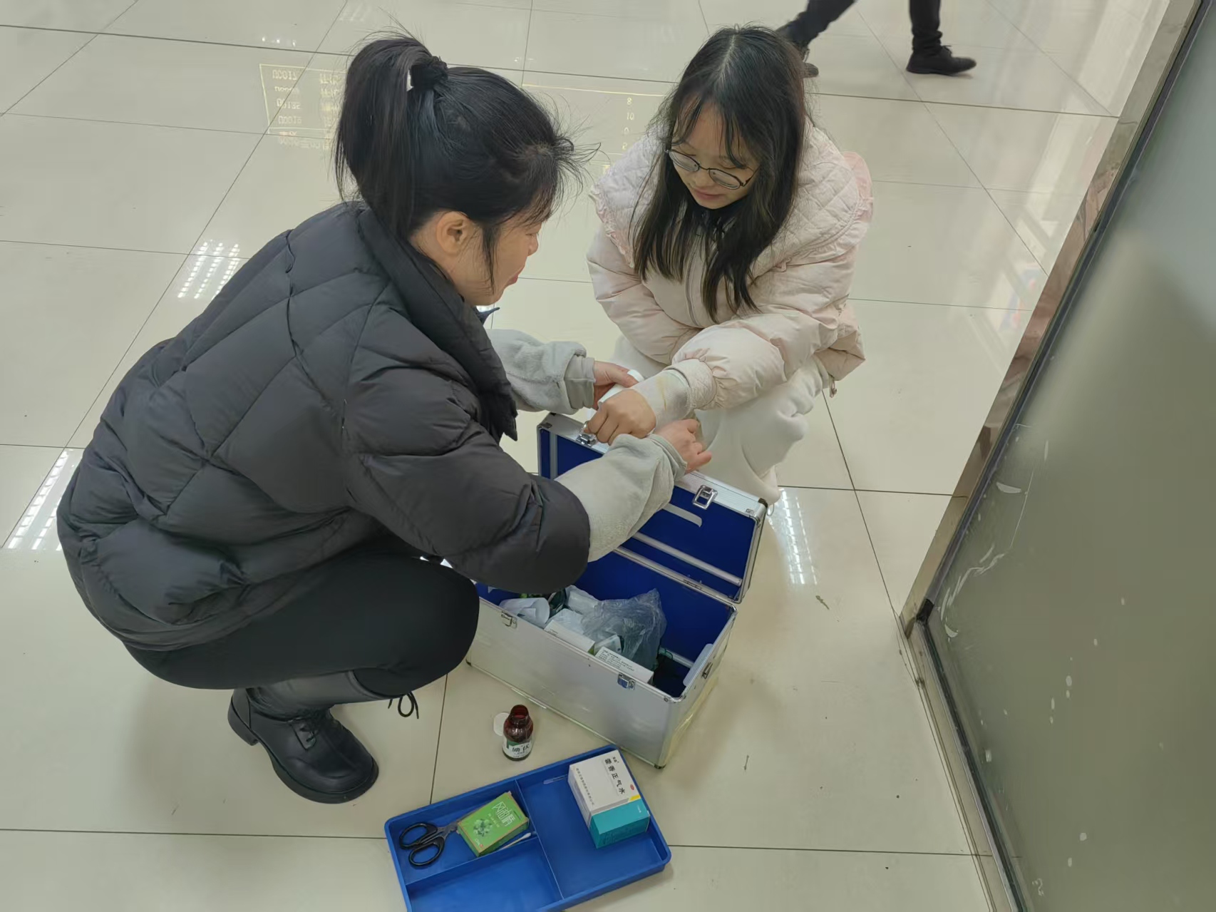 在演练的模拟现场,售票厅内一名戴口罩、持菜刀的男子突然挟持一名“乘客”,现场气氛瞬间紧张。售票员第一时间停止售票,向值班领导贺站长紧急报告请求支援。贺站长立即向公司汇报,并同步通知抓捕组、秩序维护组赶赴现场,同时亲临现场与持刀男子沟通劝阻,稳定现场局势、拖延时间,车站其他工作人员有序疏散现场“购票旅客”,避免无关人员受到波及。抓捕小组抵达后,快速对事发区域形成合围态势,在对峙过程中通过对话分散持刀男子注意力,趁其松懈之际,一名队员从后方迅速包抄,成功夺下刀具,被挟持“人质”安全逃离,抓捕组员随即合力将持刀男子制服。随后,车站医护组迅速到位,对“受伤人质”开展紧急医疗处置,整个演练流程衔接紧密、处置规范。
