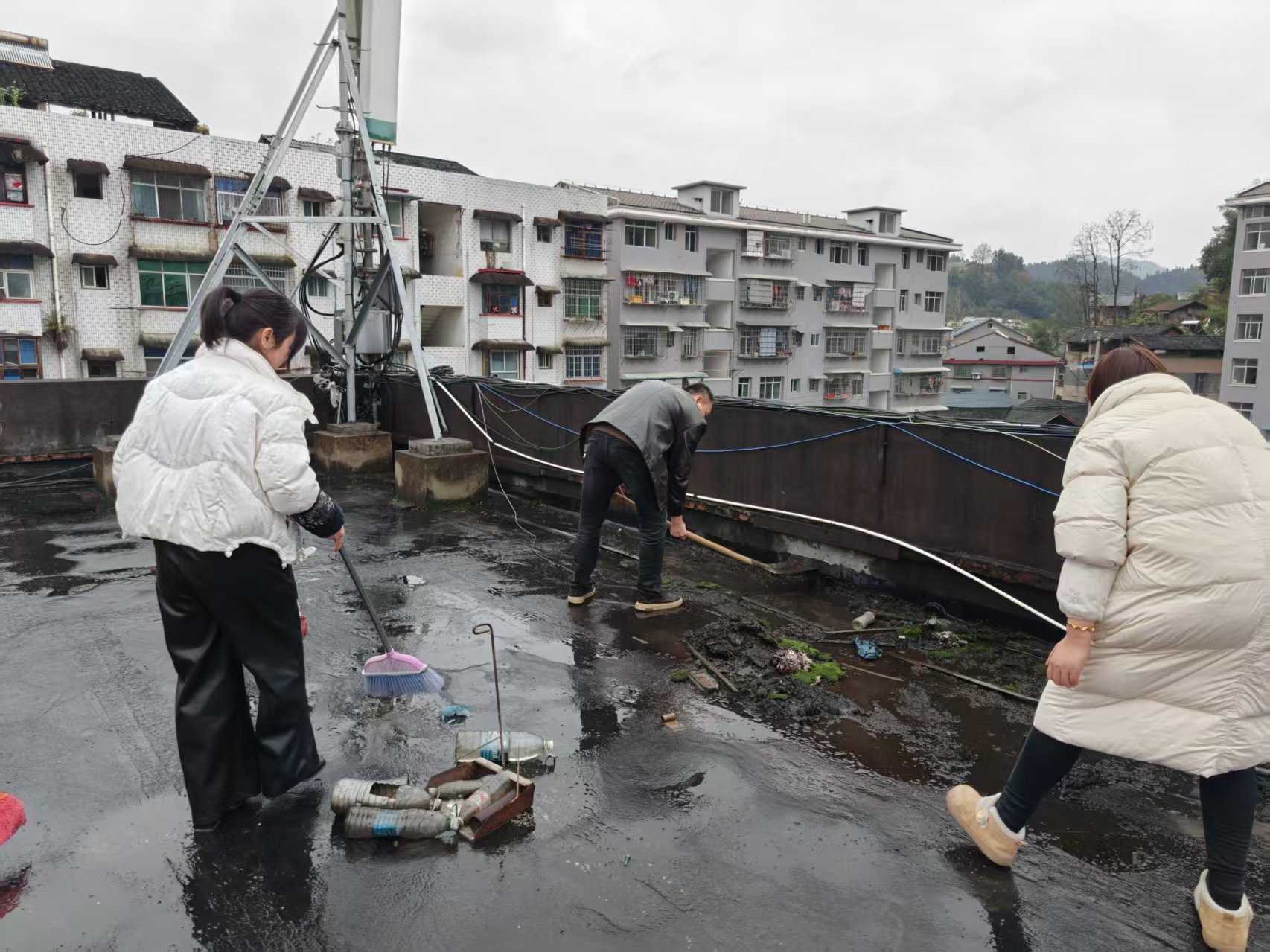 随着雨季临近,楼顶平台的落叶、泥沙等杂物极易堵塞排水口,存在雨水倒灌、渗漏的隐患。为此,分公司党支部主动作为,将此次清扫疏通活动作为一次发挥党员先锋模范作用的实践课堂。活动中,党员们手持扫帚、铁锹等工具,分工明确,配合默契。大家对顶楼平台进行了全面彻底的清扫,集中清运了堆积的枯枝落叶和尘土;重点对各个排水口、雨水管道进行了逐一检查和疏通,使用专业工具清除淤积的淤泥、杂物,确保排水系统畅通无阻。在党员们的共同努力下,平台环境焕然一新,所有排水管道均得到有效疏通。